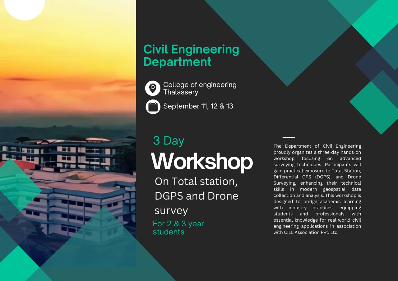 The Department of Civil Engineering at College of Engineering Thalassery was established in 2014 . The department which had a humble start with 60 students , 2 faculty members and 2 labs, flourished itself to a strength of 244 students, 10 faculty members, 5 lab staff, 9 well equipped labs and 1workshop.
